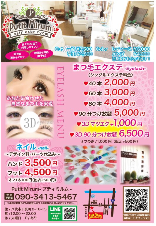 松岡李菜 旧 本山 8月nainai マツエク 3dマツエク ジェルネイルハンド フット ご予約お待ちしてます 美容室プティミルム 営業時間11 00 22 00 定休日 火曜日 Tel 090 3413 5467 Lineid Pm1001 八代市千反町2 10 15 駐車場有り Hp T